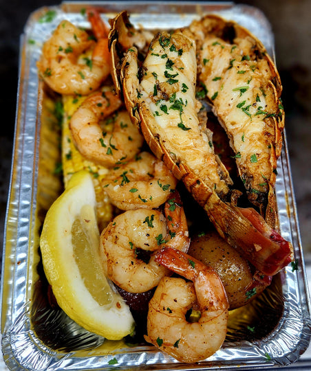 1 North Atlantic Lobster Tail, Jumbo Shrimp, Potatoes, Corn on the Cob, Sausage and Signature Garlic Butter